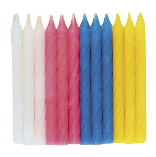 Brighten up any celebration with these vibrant Twist Design Candles from Party Direct! This 24-pack features an assortment of eye-catching colors—including classic white, bold red, cool blue, and sunny yellow—perfect for adding a festive touch to birthday cakes, cupcakes, and special occasion desserts.