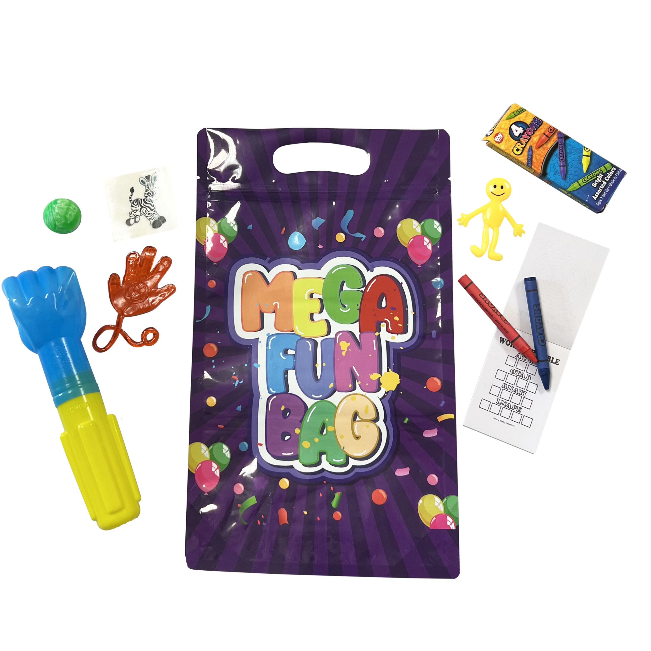 Introducing the Mega Fun Purple Palooza Mylar Bag, your ultimate party companion! This vibrant bag is bursting with excitement, featuring a playful design adorned with colorful balloons and the cheerful “MEGA FUN BAG” logo. Perfect for birthday parties, playdates, or any festive occasion, this bag is filled with delightful surprises that will keep kids entertained for hours. Inside, you’ll find a variety of fun items, including a paddle ball, a mini coloring book, crayons, stickers, and even a playful figurine!